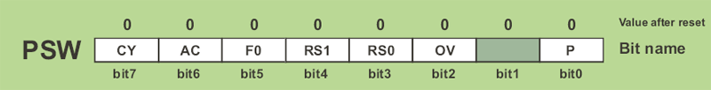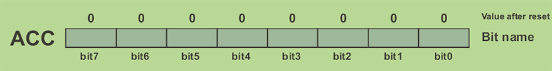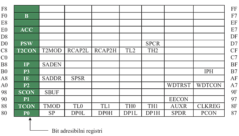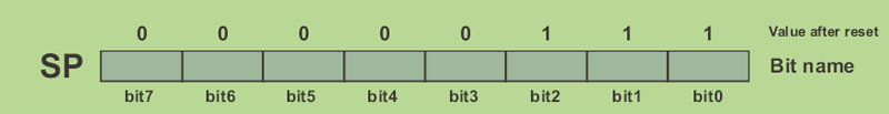 Special function registers are part of RAM memory. Their purpose is predefined by the manufacturer and cannot be changed therefore. Since their bits are physically connected to particular circuits within the microcontroller, such as A/D converter, serial communication module etc., any change of their state directly affects the operation of the microcontroller or some of the circuits. For example, writing zero or one to the SFR controlling an input/output port causes the appropriate port pin to be configured as input or output. In other words, each bit of this register controls the function of one single pin.