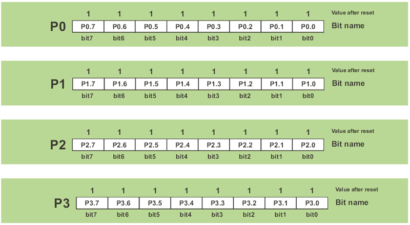 In order to make the microcontroller useful, it is necessary to connect it to peripheral devices. Each microcontroller has one or more registers (called a port) connected to the microcontroller pins. Why do we call them input/output ports? Because it is possible to change a pin function according to the user's needs. These registers are the only registers in the microcontroller the state of which can be checked by voltmeter!