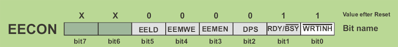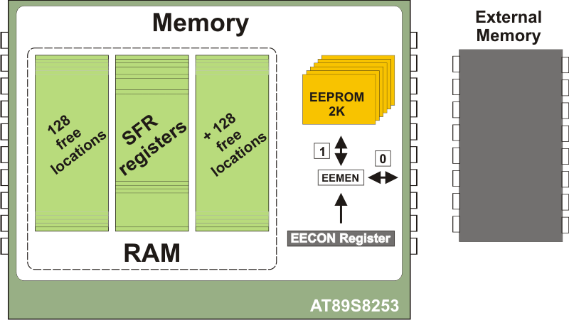 The EEPROM is a special type of memory not contained in all microcontrollers. Its contents may be changed during program execution (similar to RAM ), but remains permanently saved even after the loss of power (similar to ROM). It is often used to store values, created and used during operation (such as calibration values, codes, values to count up to etc.), which must be saved after turning the power supply off. A disadvantage of this memory is that the process of programming is relatively slow. It is measured in miliseconds.