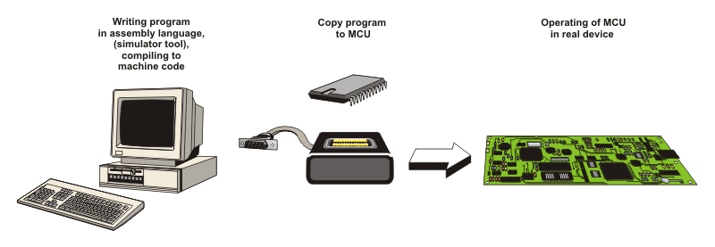 In order to create a device controlled by the microcontroller, it is necessary to provide the simplest PC, program for compiling and simple device to transfer the code from PC to the chip itself.
